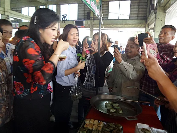 ‘ยิ่งลักษณ์’ ยังอยู่ร้อยเอ็ด เดินตลาดใหญ่กลางเมือง ซื้อข้าวจี่ กินข้าวหน้าเป็ด แม่ค้าตะโกนสู้สู้ พร้อมเอาปฏิทินต้องห้ามมาให้เซ็นชื่อเป็นที่ระลึก